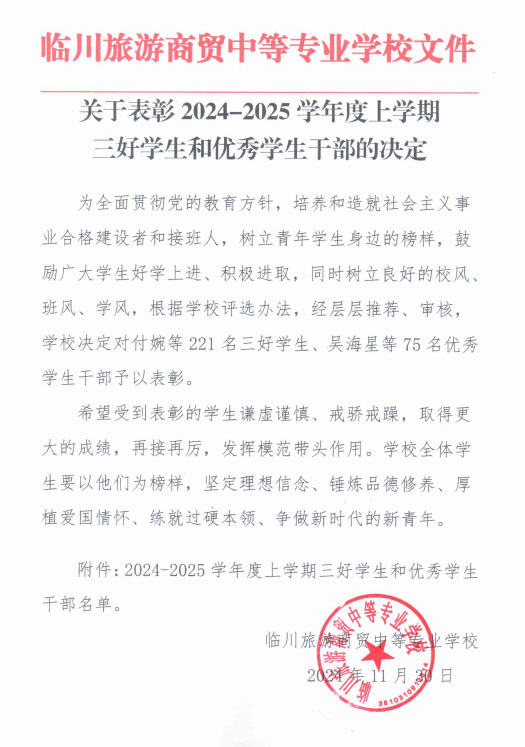 2024-2025学年度上学期 三好学生和优秀学生干部名单
